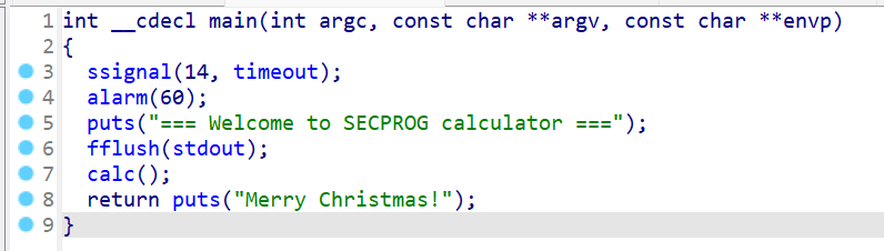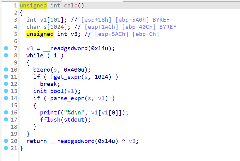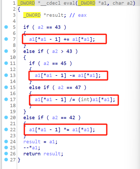 1 2 3 4 5 6 7 8 9 10 11 12 13 14 15 16 17 18 19 20 21 22 23 24 25 26 27 28 29 30 31 32 33 34 35 36 37 38 39 40 41 42 43 44 45 46 47 48 49 50 51 52 53 54 55 56 57 for ( i = 0 ; ; ++i ) { if ( (unsigned int )(*(char *)(i + a1) - 48 ) > 9 ) { v7 = i + a1 - v4; s1 = (char *)malloc (v7 + 1 ); memcpy (s1, v4, v7); s1[v7] = 0 ; if ( !strcmp (s1, "0" ) ) { puts ("prevent division by zero" ); fflush(stdout ); return 0 ; } v9 = atoi(s1); if ( v9 > 0 ) { v3 = (*a2)++; a2[v3 + 1 ] = v9; } if ( *(_BYTE *)(i + a1) && (unsigned int )(*(char *)(i + 1 + a1) - 48 ) > 9 ) { puts ("expression error!" ); fflush(stdout ); return 0 ; } v4 = i + 1 + a1; if ( s[v6] ) { switch ( *(_BYTE *)(i + a1) ) { case '%' : case '*' : case '/' : if ( s[v6] != 43 && s[v6] != 45 ) goto LABEL_14; s[++v6] = *(_BYTE *)(i + a1); break ; case '+' : case '-' : LABEL_14: eval(a2, s[v6]); s[v6] = *(_BYTE *)(i + a1); break ; default : eval(a2, s[v6--]); break ; } } else { s[v6] = *(_BYTE *)(i + a1); } if ( !*(_BYTE *)(i + a1) ) break ; } }