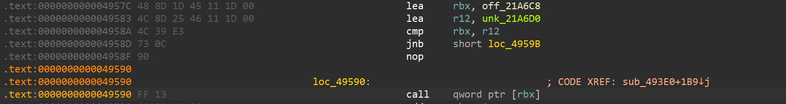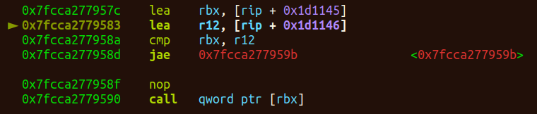 把偏移为0x21a6c8的地址赋值给rbx,偏移0x21a6D0的地址赋值给r12,这里rbx < r12,所以会执行call qword ptr [rbx],所以只需将 0x21a6c8 的值赋为 one_gadget 就可以了